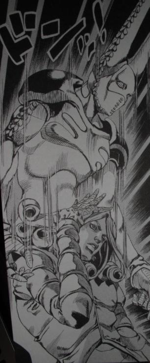 ファニーたんがスタンドを出している場面ですがカッコよ過ぎ。なにがもうカッコいいかってこの無駄な右手。もう絶対いらいないから!でももうそんなとこも含めてカッコいいっすねー。SBRの初期ではこいつがラスボスになるのかっー?なんて思ってましたが後半にきてファニちゃんまさかの大化けですね。ムキムキなるし。とにかっくこのD4Cかっこよすぎですよ。まあただザワールド以降のラスボスってなんていうか能力でゴリ押ししてる感があると思うんですよ。キラークイーンはアナザーワンバイツァダストで一瞬であいて爆破しちゃうし、キングクリムゾンなんて時間すっ飛ばしてかならず背後あたりに回って相手が何が起こったか察しないうちにブッチぎるんですよ。大人気ないですよ。メイドインヘヴンとか殴らないんですよ、手刀がもうカミソリのようなんですって、速過ぎて。ザワールドなんて時間止めてればいくらでも承太郎にトドメさせるのに仲良くド突きあってくれるんですよ。体育会系ですよ考えが。カーズとかディオとかメッチャ体育会系の精神でやってくれるのに他のラスボス勢はもう文化系ですよ、「知恵が全てだ」と。もっとこうド突き合って欲しいものですね。